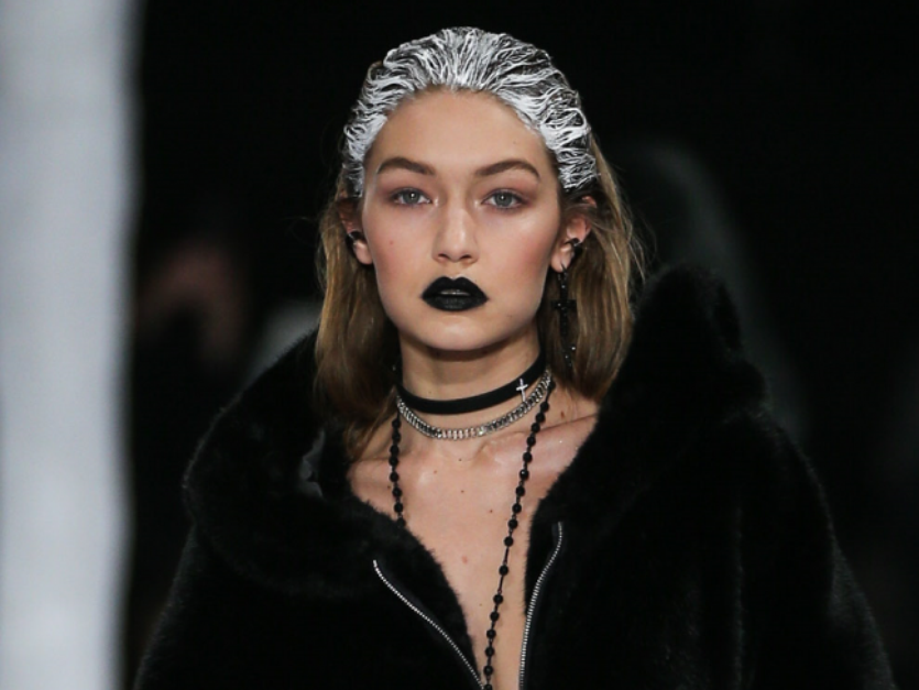 A beleza de Gigi Hadid para o desfile da colaboração entre Fenty e Puma é a inspiração de Halloween que faltava para quem gosta de um visual mais elaborado: é que a "maquiagem" não fica restrita ao rosto e invade também as madeixas. Olhos esfumados, que podem ser usados tanto na make do dia a dia como em festas ou outros eventos noturnos, e maçãs do rosto marcadas com tons terrosos ajudam a construir a beleza que tem como protagonista lábios pretos com acabamento fosco. O efeito de "descolorido" na raiz dos fios vem para arrematar a produção com pegada gótica e pode ser reproduzido facilmente com um pouco de tinta branca.