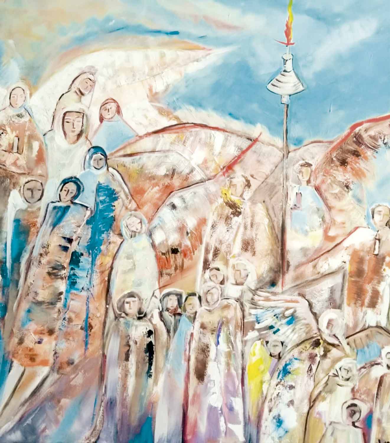Delma Braga se inspirou nos anjos para compor sua tela. Josefina escolheu também esta temática destacando entre o brilho e cores a forma delicada desses seres celestiais.