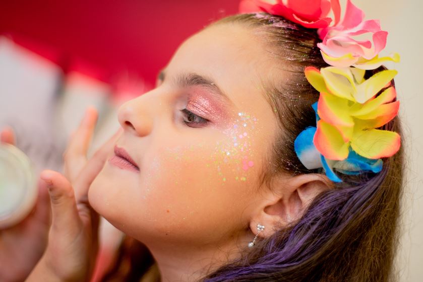 “Sou totalmente contra usar produtos de adultos em criança”, reforçou a mãe. As maquiagens aplicadas em Maria são veganas e o glitter é da Color Make, marca especializada em produções artísticas.