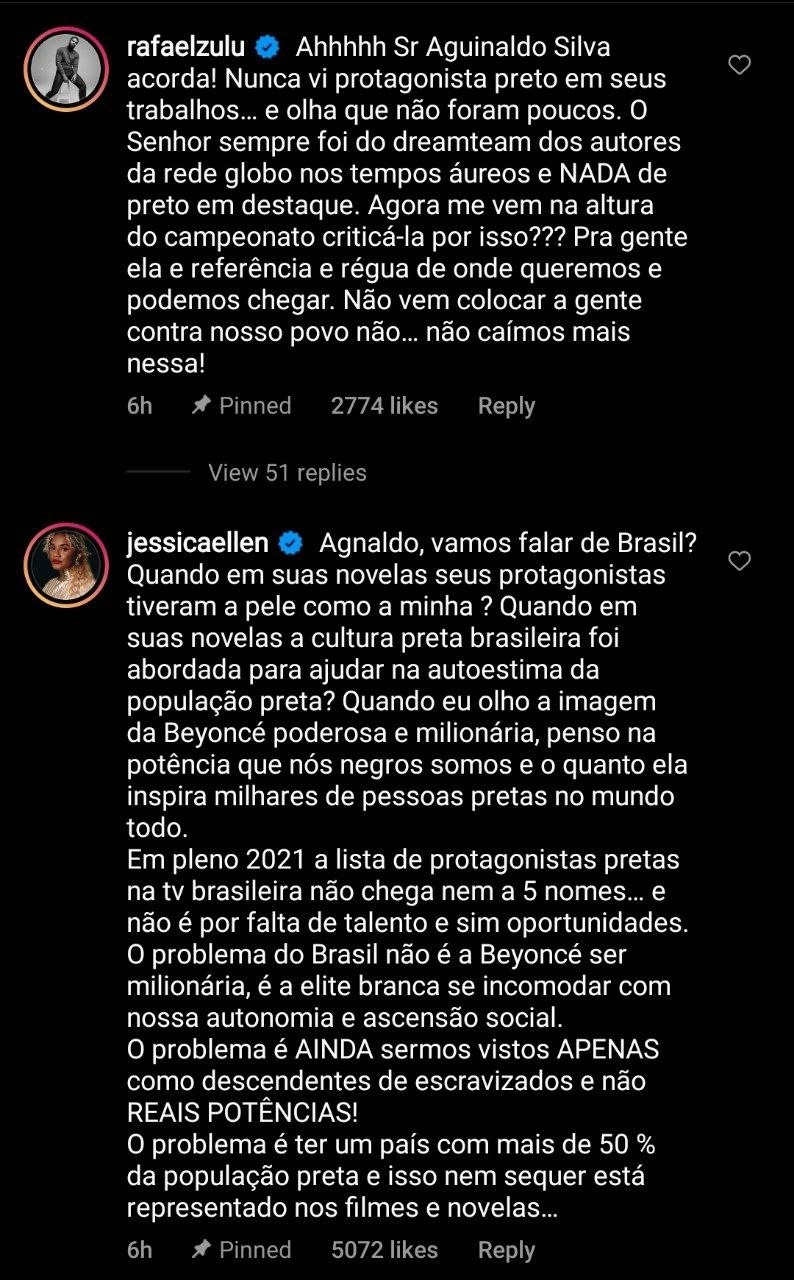 "Agnaldo, vamos falar de Brasil? Quando em suas novelas seus protagonistas tiveram a pele como a minha? Quando em suas novelas a cultura preta brasileira foi abordada para ajudar na autoestima da população preta? Quando eu olho a imagem da Beyoncé poderosa e milionária, penso na potência que nós negros somos e o quanto ela inspira milhares de pessoas pretas no mundo todo. Em pleno 2021, a lista de protagonistas pretas na TV brasileira não chega nem a 5 nomes… E não é por falta de talento e sim oportunidades. O problema do Brasil não é a Beyoncé ser milionária, é a elite branca se incomodar com nossa autonomia e ascensão social. O problema é AINDA sermos vistos APENAS como descendentes de escravizados e não REAIS POTÊNCIAS! O problema é ter um país com mais de 50% da população preta e isso nem sequer está representado nos filmes e novelas…”, escreveu Jéssica.