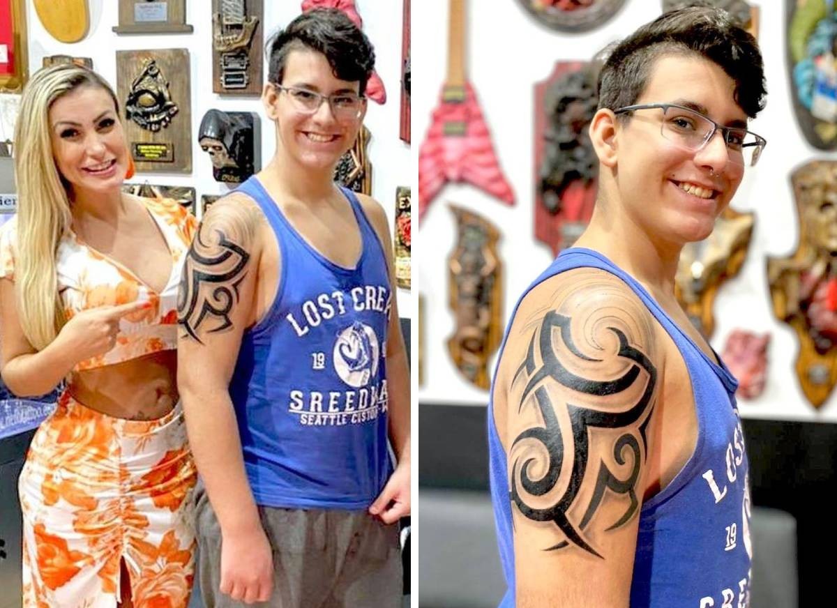 Andressa Urach acompanhou o filho, Arthur, de 15 anos, fruto de um relacionamento do passado, na segunda sessão da tatuagem que ele está fazendo no braço e compartilhou o momento em seu Instagram nesta terça-feira (2). A modelo, que agora é garota-propaganda e sócia do Miss Bumbum, concurso que a tornou famosa, foi criticada por alguns seguidores pela sua atitude e mandou um recado cheio de ironia para os haters, principalmente os que estão usando a religião para os comentários.