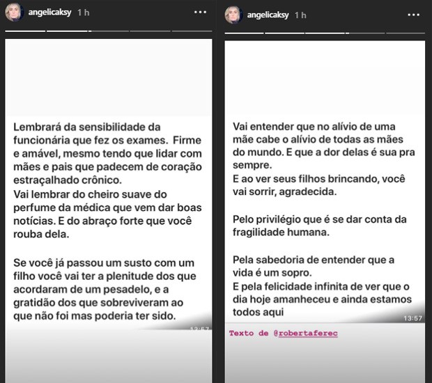 ''Vai entender que no alívio de uma mãe cabe o alívio de todas as mães do mundo. E que a dor delas é sua para sempre. E ao ver seus filhos brincando, você vai sorrir, agradecida. Pelo privilégio que é se dar conta da fragilidade humana. Pela sabedoria de entender que a vida é um sopro. E pela felicidade infinita de ver que o dia hoje amanheceu e ainda estamos todos aqui”, dizia o texto escrito por Roberta Ferec''.