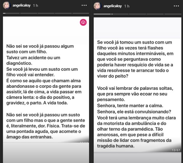 Angélica usou seu Instagram para postar um texto emocionante sobre maternidade após o grave acidente sofrido pelo filho do meio, Benício, de 11 anos. Ele se acidentou enquanto praticava wakeboard em Ilha Grande, na Costa Verde do Rio, na tarde de sábado (22). O garoto foi submetido a uma neurocirurgia no Hospital Copa Star, na Zona Sul do Rio de Janeiro, no domingo (23)