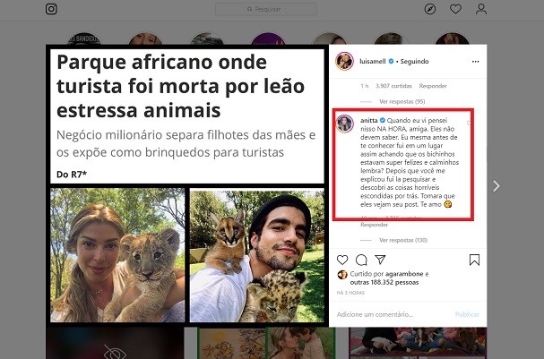 Seguidores apoiaram o desabafo de Luísa Mell, inclusive, Anitta. "Quando eu vi pensei nisso NA HORA, amiga. Eles não devem saber. Eu mesma antes de te conhecer fui em um lugar assim achando que os bichinhos estavam super felizes e calminhos lembra? Depois que você me explicou fui la pesquisar e descobri as coisas horríveis escondidas por trás. Tomara que eles vejam seu post. Te amo", afirmou a cantora.