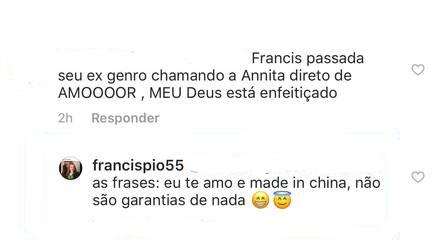 Tudo começou quando uma internauta criticou o fato de Scooby sempre chamar Anitta de "meu amor" nos Stories do Instagram. Francis, estou passada. Seu eu-genro chamando a Anitta direto de amor. Meu Deus, está enfeitiçado", ressaltou a seguidora.