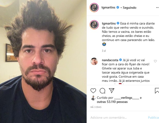 Vale lembrar que há alguns dias, Thiago reclamou da aglomeração de pessoas em bares e nas praias do Rio e fez um post protestando em seu Instagram. "Essa é minha cara diante de tudo que venho vendo e ouvindo. Não temos vacina, os bares estão cheios, as praias estão cheias e eu continuo em casa parecendo um leão", declarou ele na ocasião.