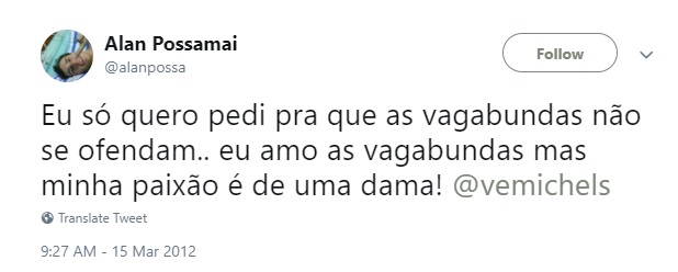 "Eu só quero pedir para que as vagabundas não se ofendam. Eu amo as vagabundas, mas a minha paixão é de uma dama!", escreveu o participante do reality show em 15 de março de 2012.