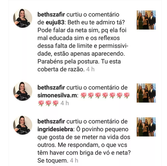 Beth não costuma responder, mas vem curtindo vários deles. "Eu não suporto a Sasha, e vi que sempre estive certo. Nem a avó dela gosta dela. Realmente a Sasha coisa boa não é, minha intuição não engana", disse um seguidor e um dos comentários curtido por ela.