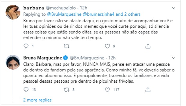 A atriz ainda falou que há perfis que envolvem nomes de familiares e amigos nas brigas e deu uma bronca em uma fã. "Nunca mais pense em atacar uma pessoa de dentro do fandom pela sua aparência. Como minha fã, você deveria saber o quanto eu abomino isso. E principalmente, trazendo os familiares e a vida pessoal dessas pessoas pra dentro de picuinhas frívolas."