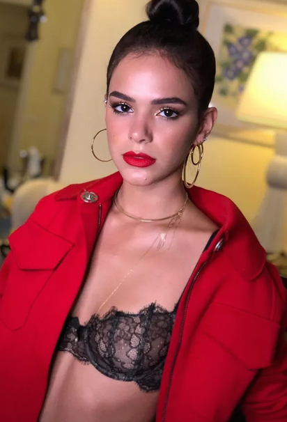 Em clique compartilhado pelo maquiador Lucas Vieira, a atriz aparece não somente com os lábios avermelhados, mas também com uma camisa no mesmo tom e um sutiã de renda transparente à mostra.