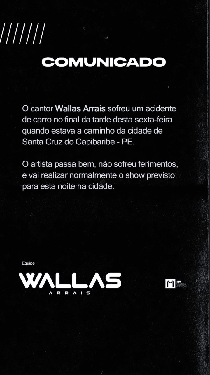 Em nota, a assessoria disse que o artista passa bem e não sofreu ferimentos. Após o acidente, Wallas Arrais realizou o show normalmente em Santa Cruz do Capibaribe.