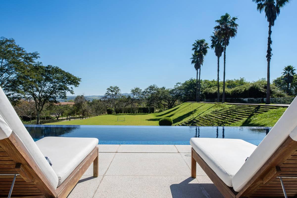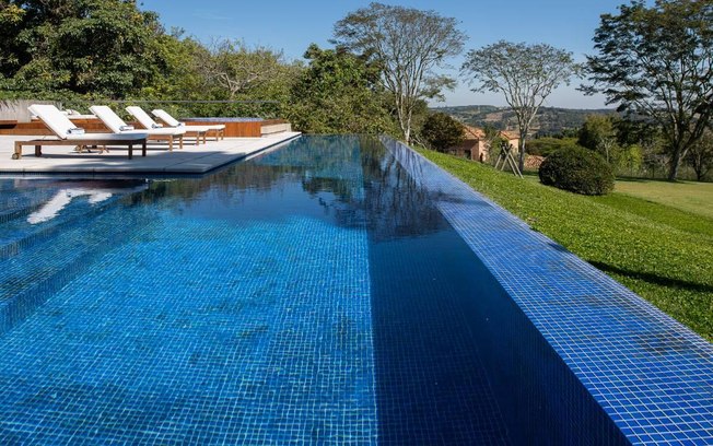 O anúncio do site Imovelweb diz o seguinte: Hall de entrada com pé direito duplo, sala de estar com 2 ambientes, sala de jantar, home theather, lavabo, sala íntima com TV. São 8 suítes, sendo a suíte principal com closet e 2 banheiros (Sr. e Sra.), rouparia, cozinha gourmet, ampla varanda com 4 ambientes mais churrasqueira e forno de pizza, piscina, jacuzzi, sauna úmida, salão de jogos, quadra de tênis, mini campo de futebol gramado, playground, residência para caseiros, suíte para babás, mini horta, canil.