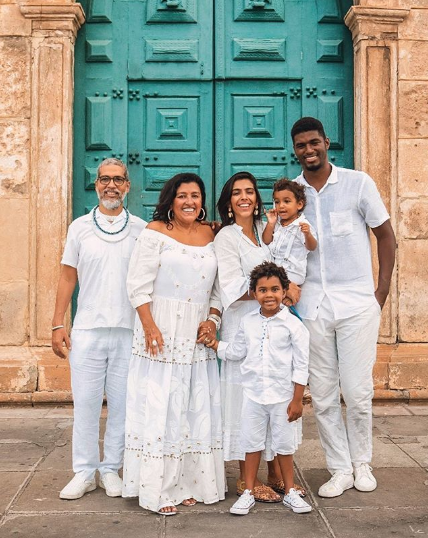 Na imagem, a Lurdes de "Amor de mãe" aparece ao lado do marido, o diretor Estevão Ciavatta, dos filhos Benedita e Roque, do neto, Brás, e do enteado, João Pedro Januário. Todos vestem branco.