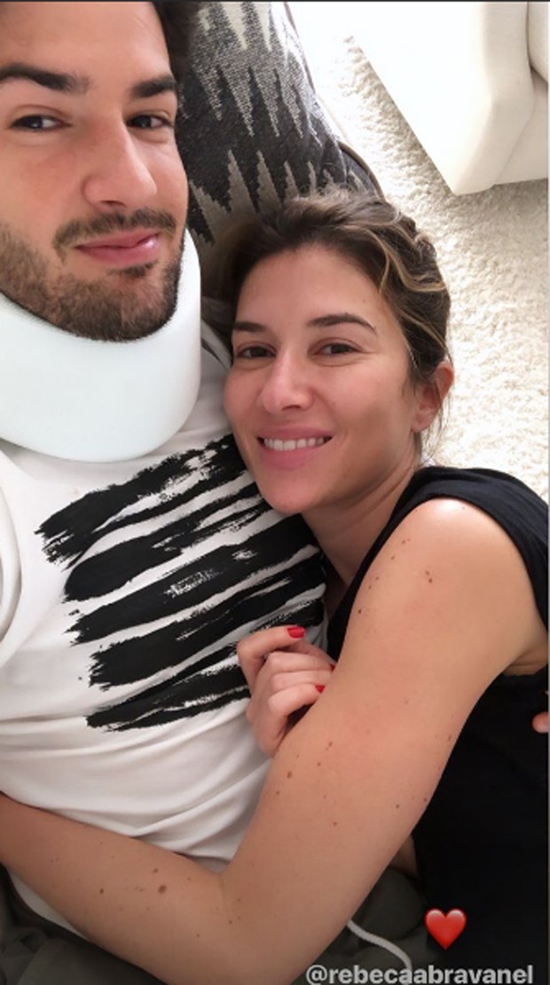 Recebendo os cuidados da namorada Rebeca Abravanel, o jogador mostrou um clique com a amada, com direito a emoji de coração, nesta segunda-feira (6). No clique, eles estão agarradinhos e sorrindo.