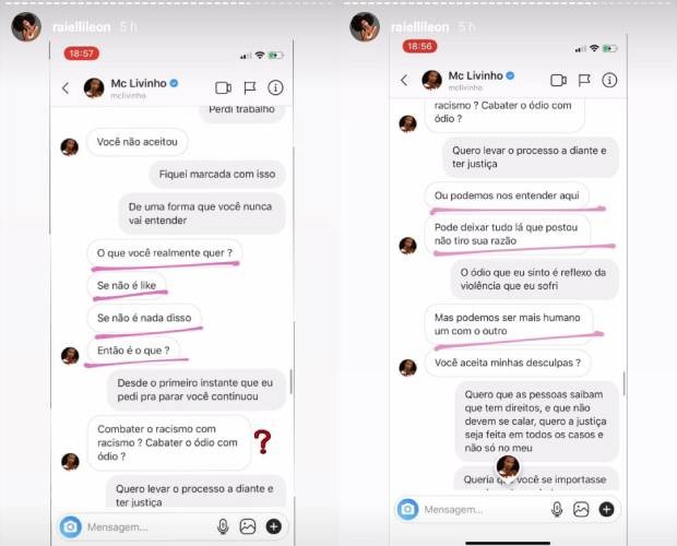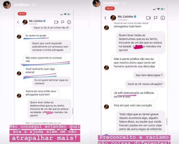 Nos prints, é possível ver que Livinho pede desculpas, mas também diz que Raielli está querendo aparecer e que ela não precisa disso, pois tem brilho e talento. A dançarina responde, falando que o funkeiro comprou a advogada dela, a ameaçou e ela perdeu muitos trabalhos, além de que ele não se importa de verdade.