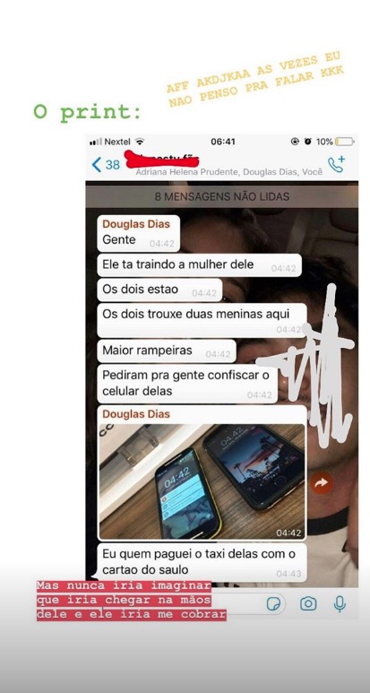 Em seguida, o internauta diz que tudo aconteceu por conta de uma conversa printada no WhatsApp, que acabou gerando uma consequência direta em sua vida, pois perdeu o emprego. "Mas enfim o prazer de jogar", argumenta sobre a exposição. Portanto, ele publica uma série de vídeos que o artista aparece em um hotel, ao lado do parceiro de banda Luan Lourenço. Um pouco mais tarde, as meninas chegam e depois Saulo busca mais bebida.