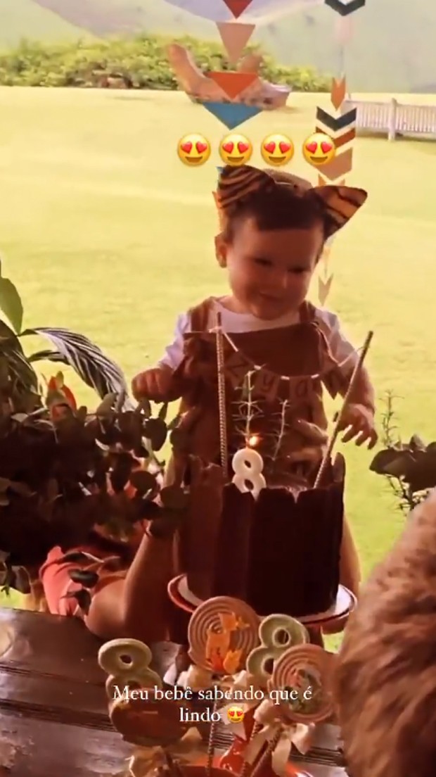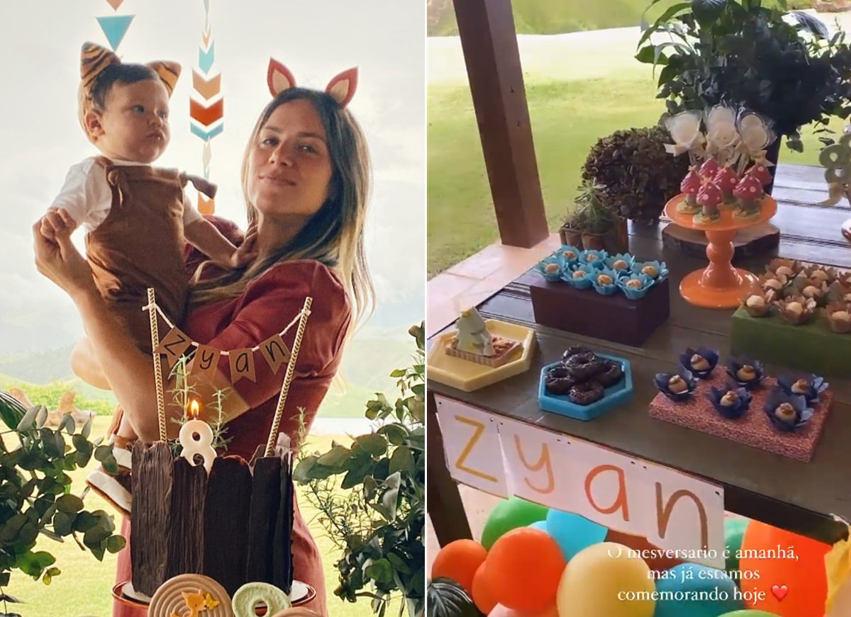 O próprio Zyan estava vestido com macacão marrom, combinando com a decoração, e usava orelhinhas de animal. "E não é que meu baby vai fazer oito meses, meu Deus do céu? Oito meses e, olha, o tema do mesversário é floresta", disse Giovanna, acrescentando posteriormente, na hora dos parabéns: "Meu bebê sabendo que é lindo".