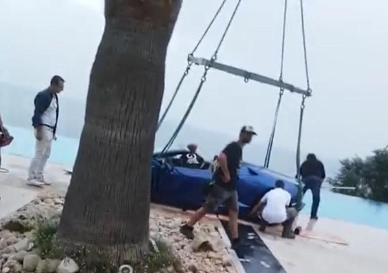 Usando sapatos de salto alto, ela tentou estacionar a Lamborghini próxima a uma piscina. No entanto, seu pé acabou escapando do pedal de freio, o que jogou o carro na piscina.