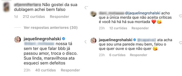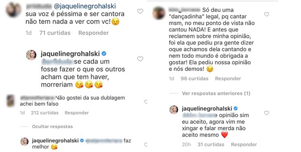 "Bom rapaz. Quem ainda não ouviu o áudio da minha música está na bio meus nenéns", escreveu ela na legenda dos vídeos. "Sua voz é péssima e ser cantora não tem nada a ver com você", disse uma internauta. "Se cada um fosse fazer o que os outros acham que tem a ver, morreriam", rebateu a ex-BBB. "Não gostei da sua dublagem, achei bem falso", falou outra. "Faz melhor", escreveu Jaqueline.