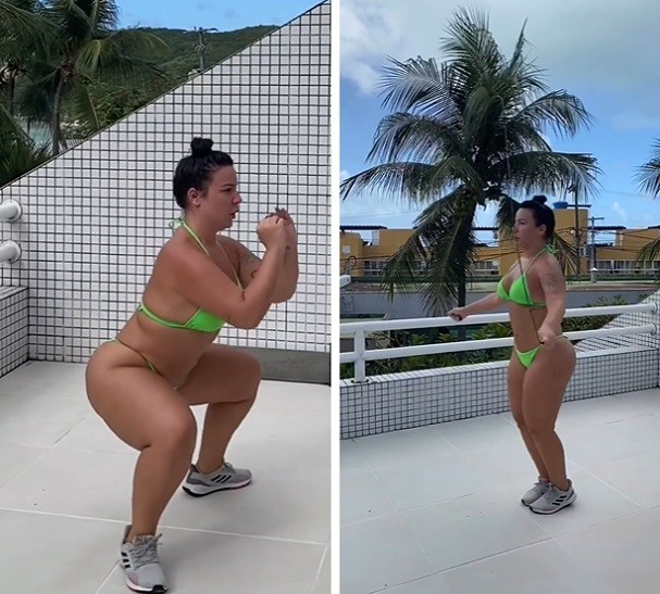 Depois, a ex-BBB ainda explicou o motivo de treinar de biquíni. "Cacau, por que você treina de biquíni? Veja o suor saindo e a vitamina D entrando, meu amor #corpolivre #autocuidado", contou.