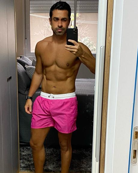 O famoso posou só de short rosa e exibiu o corpo musculoso em brincadeira às fotos “biscoiteiras”.