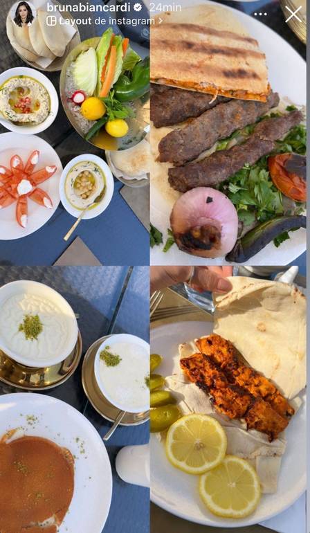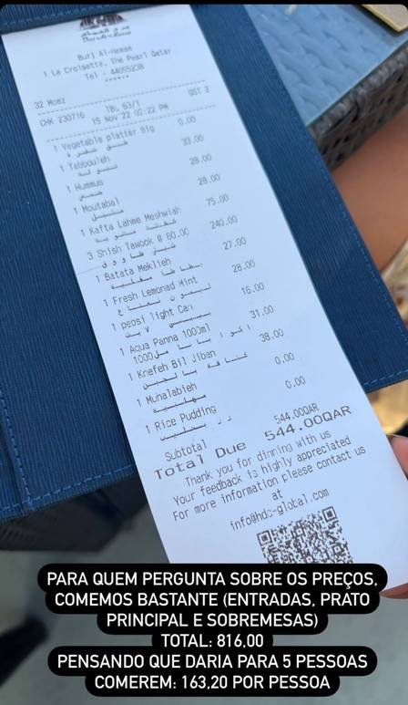 Bruna almoçou com duas amigas e afirmou que "comeu bastante", já que o preço dava direito a entradas, prato principal e sobremesa. O trio pagou 544 na moeda local, rial do Qatar. O valor é equivalente a R$ 816. "Pensando que daria para cinco pessoas comerem, seria R$ 163,20 por pessoa", explicou a influenciadora.