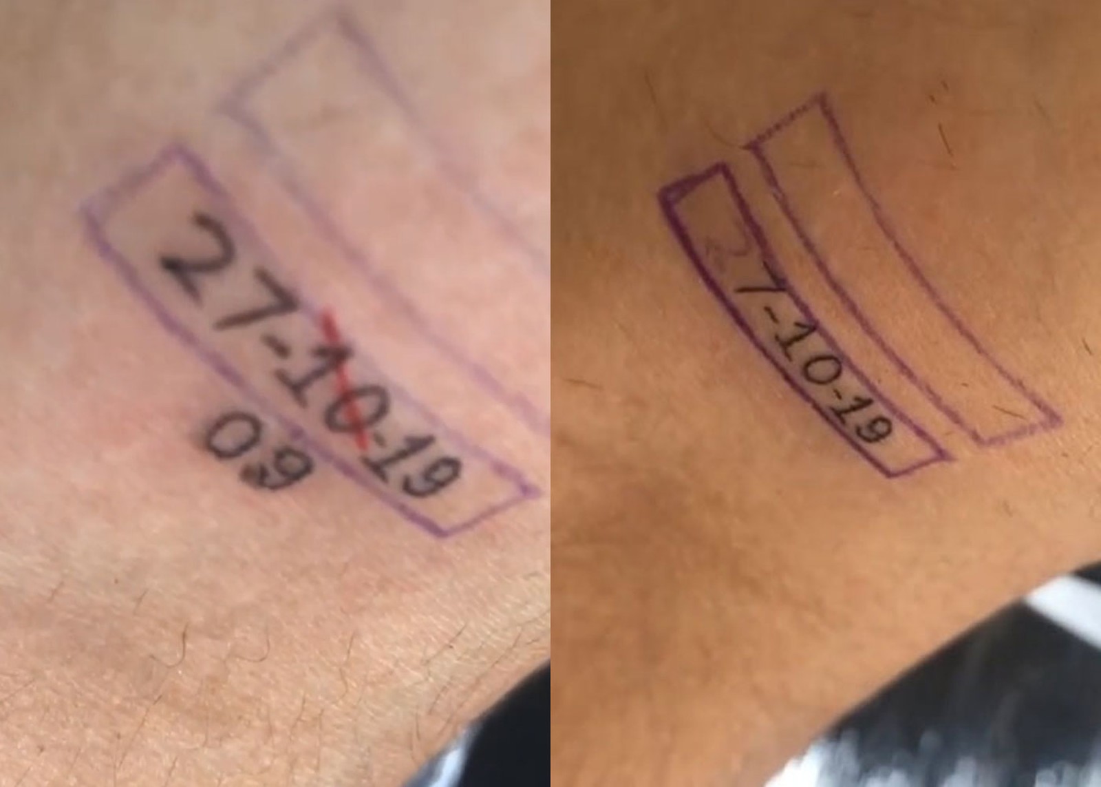 Depois do erro, ele tatuou um risco no mês errado e pediu que o tatuador colocasse o mês certo.