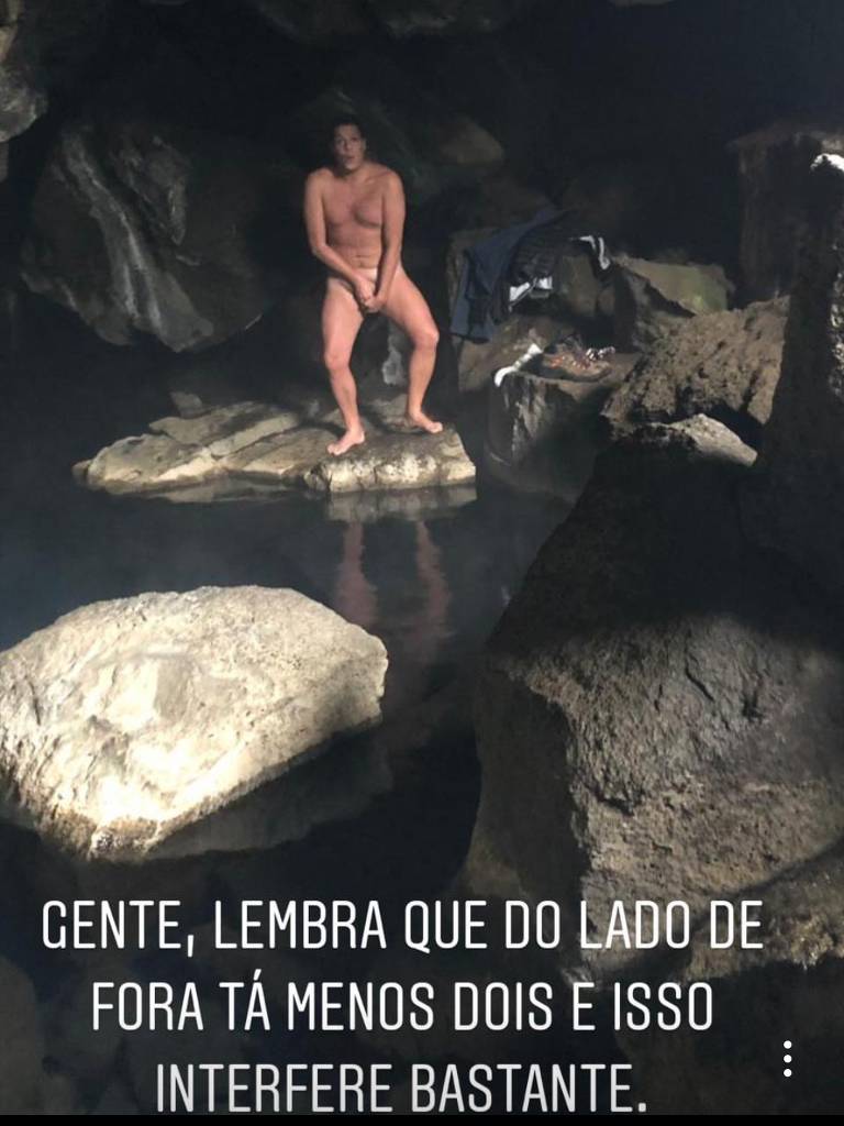 O humorista Fábio Porchat e sua mulher Nataly Mega estão passando as férias na Islândia. Em um inverno de temperaturas negativas, o casal está narrando todas as suas aventuras pelo Instagram. Em uma delas, o artista nadou pelado nas águas que ficam dentro de uma gruta de gelo.