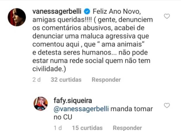 Alguns famosos prestaram apoio a Fafy sobre as mensagens preconceituosas que ela estava recebendo. "Gente, denunciem os comentários abusivos, acabei de denunciar uma maluca agressiva que comentou aqui que 'ama animais' e detesta seres humanos", disse Vanessa Gerbelli. "Manda tomar no c*", aconselhou Fafy.