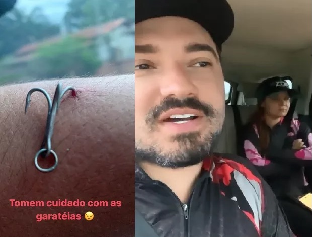 Em uma foto em que mostra um close do gancho em seu braço, o sertanejo adverte: "Tomem cuidado com as garatéias". Fernando voltou à rede social pouco depois para mostrar o braço com curativo e contar que tudo deu certo e já estava de volta ao normal, mas que sua namorada, Maiara, irmã e dupla sertaneja de Maraisa, ficou desesperada.