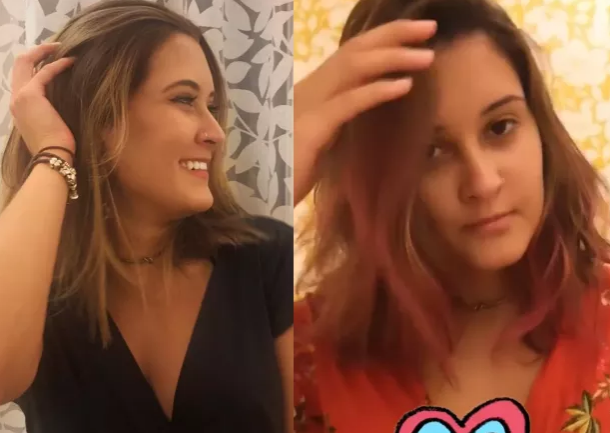 "Não acredito que fiz isso de novo, mas fiz", disse, toda sorridente. Bia escolheu escolheu a cor rosa para as madeixas.