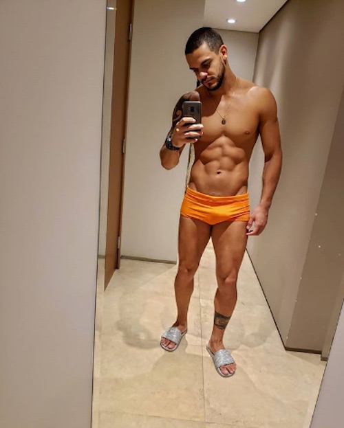 Sem camisa, só com uma sunga laranja, ele esquentou as temperaturas ao posar para um registro na frente de um espelho, localizado em um dos cômodos da casa que está.