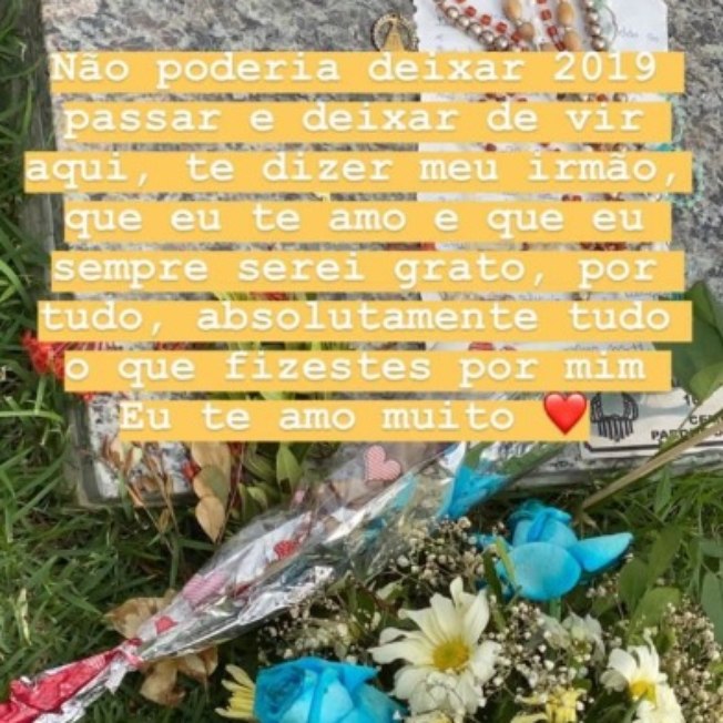 “Não poderia deixar passar 2019 sem vir aqui para te dizer meu irmão, que eu te amo e que eu sempre serei grato, por tudo o que fizestes por mim. Eu te amo muito.”, escreveu Paes na postagem publicada no Instagram. Gabriel Diniz morreu em um acidente aéreo no auge da carreira. No momento de sua morte, ele era o cantor mais tocado do Brasil com a música Jennifer.