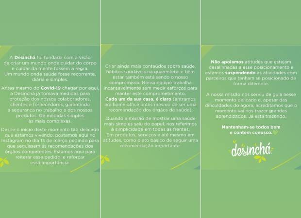 "A Liv Up tem seguido, desde o início, todas as recomendações e cuidados da OMS [Organização Mundial da Saúde] em relação à Covid-19. Adotamos uma série de cuidados com nosso time, clientes e parceiros, e recomendamos a quem pode que continue em casa e evite aglomerações. Não incentivamos atitudes que possam colocar a saúde de qualquer pessoa em risco, assim, estamos suspendendo todas as ações que tínhamos programadas com a influenciadora e adiantamos que esse é nosso posicionamento em qualquer outra situação similar", informou a Liv Up.