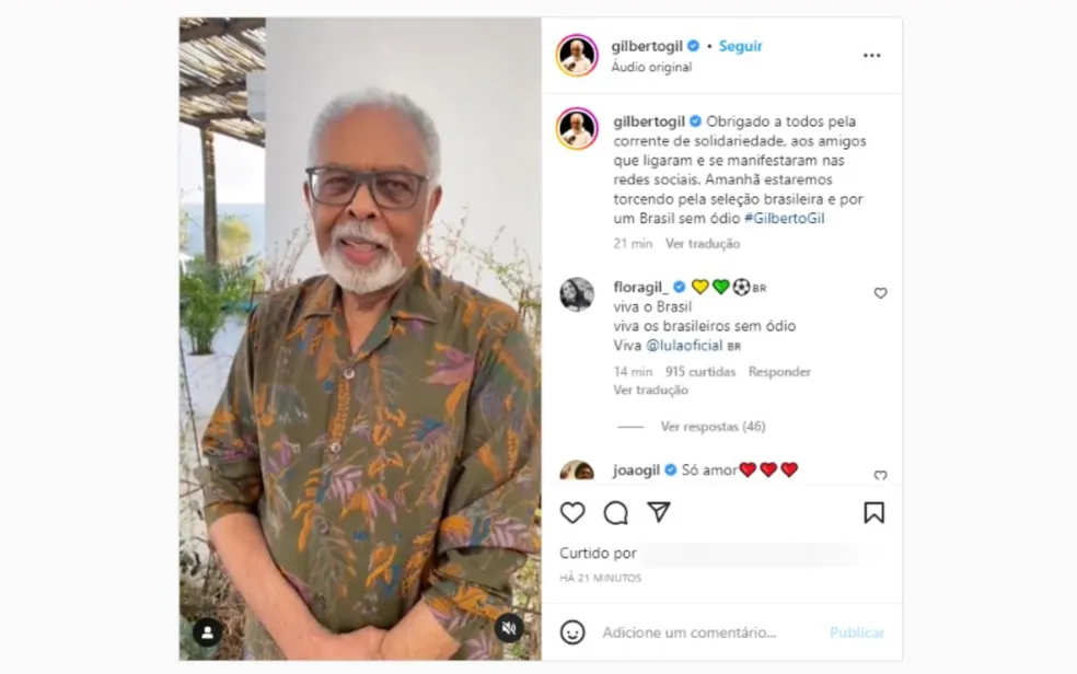 O cantor Gilberto Gil postou um vídeo na manhã deste domingo (27) para agradecer o apoio que recebeu na internet após ter sido xingado por torcedores brasileiros em jogo da seleção no estádio Lusail, no Catar.