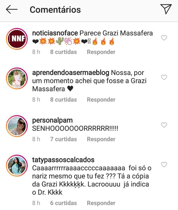 "Nossa, por um momento achei que fosse a Grazi Massafera!", disse uma fã. Outros, foram além: "Está a cópia". Até colegas famosos da influenciadora digital, como Whindersson Nunes, repararam na semelhança. "Se tu e Grazi Massafera tivessem uma filha", brincou o comediante.