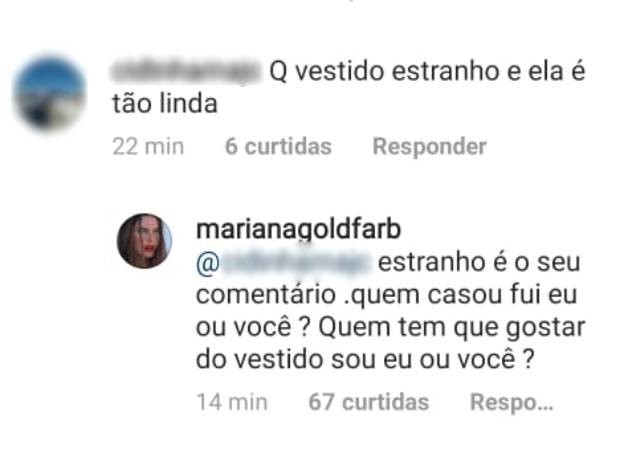 Nos comentários, os seguidores de Mariana a encheram de elogios, mas teve um que acabou criticando o look que ela escolheu pra a cerimônia. "Que vestido estranho. E ela é tão linda", escreveu a pessoa. "Estranho é o seu comentário. Quem casou fui eu ou você? Quem tem que gostar do vestido sou eu ou você?", rebateu ela, em raro momento de discussão na web.