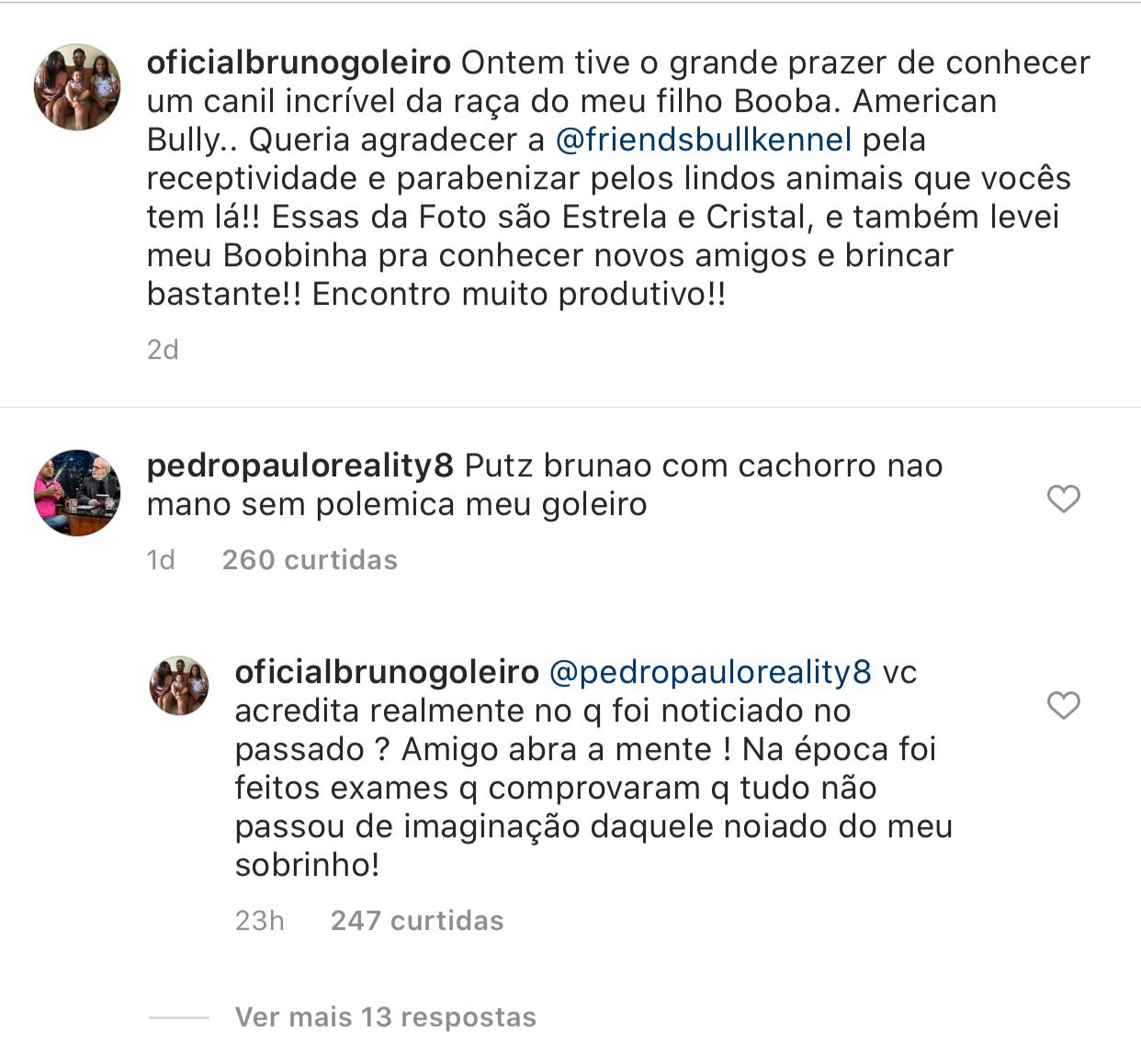 "Goleiro Bruno fazendo publi post pra um CANIL. Esse país ri da cara das mulheres", revoltou um. "Acho que nem as notícias do governo me deixaram mais assustado que goleiro Bruno fazendo propaganda para canil. É um nível de desrespeito além do que eu já vi...", comentou outro. "o goleiro Bruno postando foto no canil meu deus do céu gente esse país é um circo!!!!", escreveu mais um.