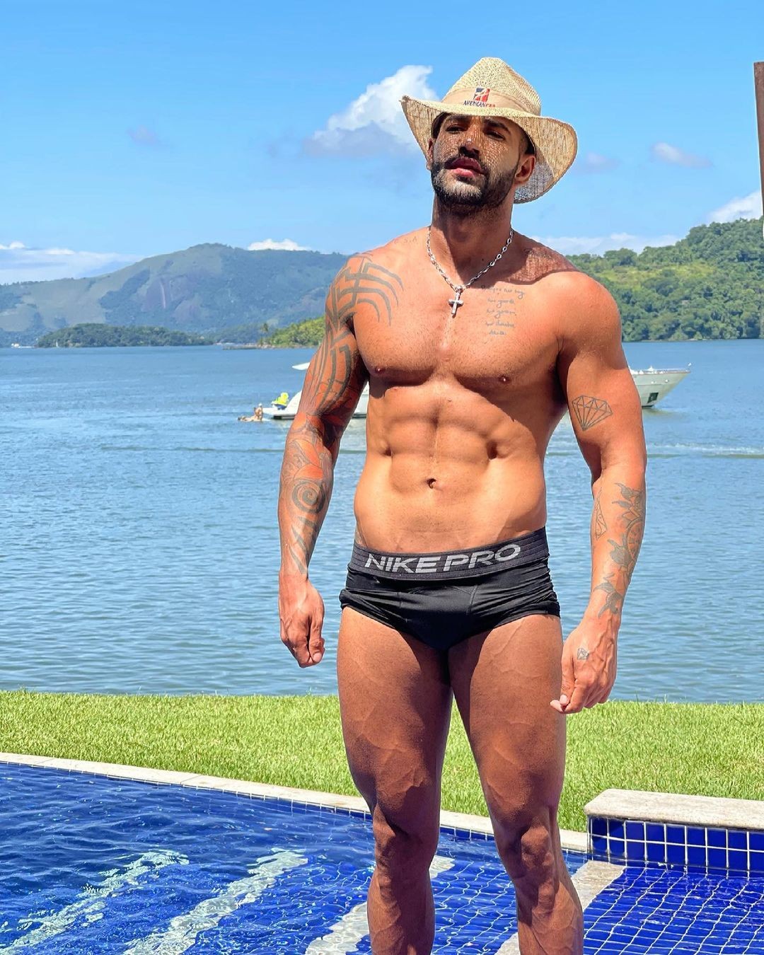 Gusttavo Lima, que está passando uns dias de férias em Angra dos Reis, no litoral sul do Rio, mostrou o tanquinho sarado e as veias saltadas em dois cliques no Instagram nesta terça-feira (16). De sunga e usando um chapéu de palha, com direito a crucifixo no peito, o cantor de 31 anos posou à beira-mar e fez careta em uma das fotos. As informações são da Quem.