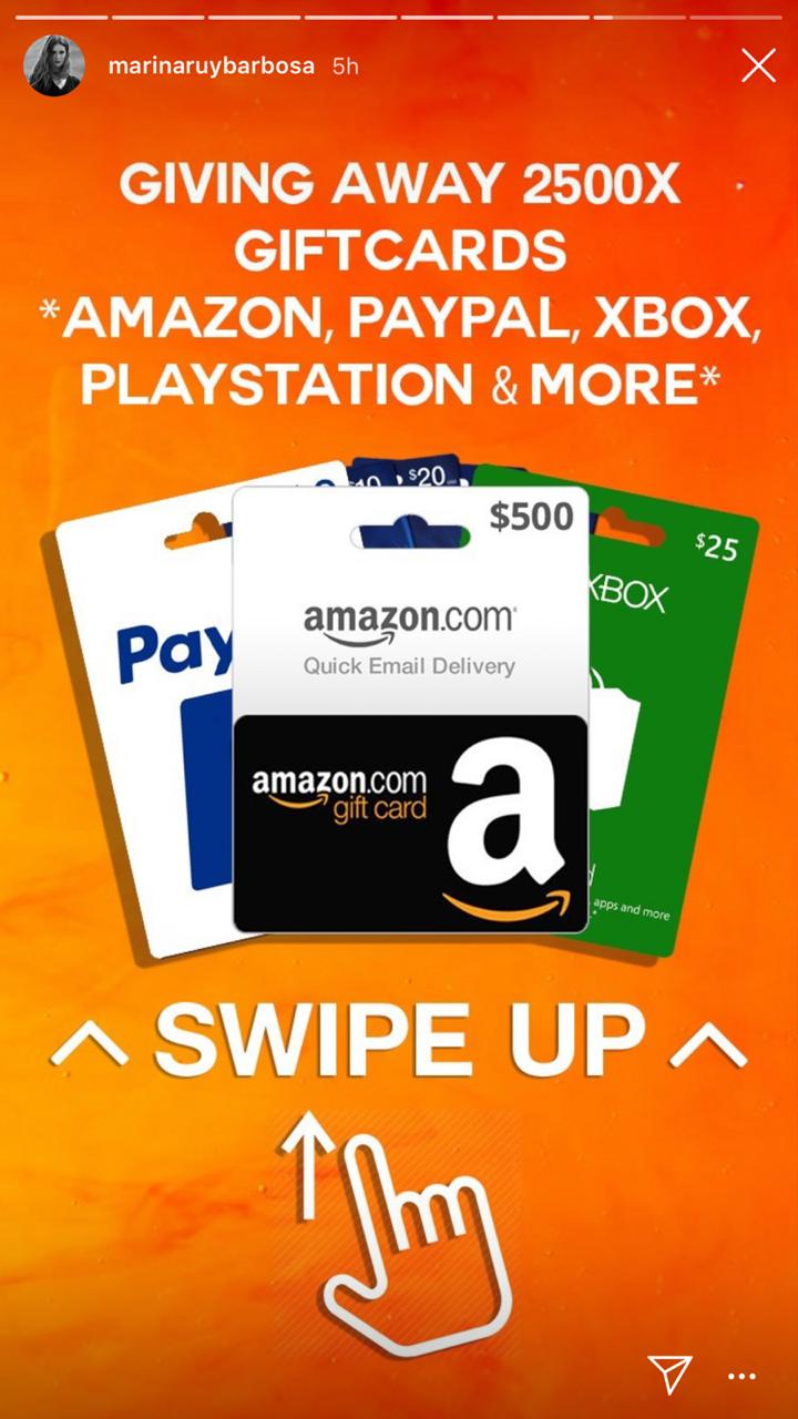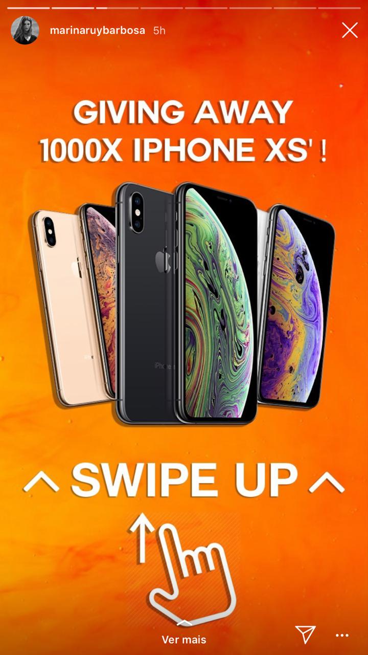 Já nos stories, seis publicações foram expostas, mas com produtos diferentes: em inglês, são oferecidos iPhones, Macbooks e outros eletrônicos caríssimos. Para "ganhar", era necessário deslizar o celular para um link - relatado por fãs da atriz como vírus.