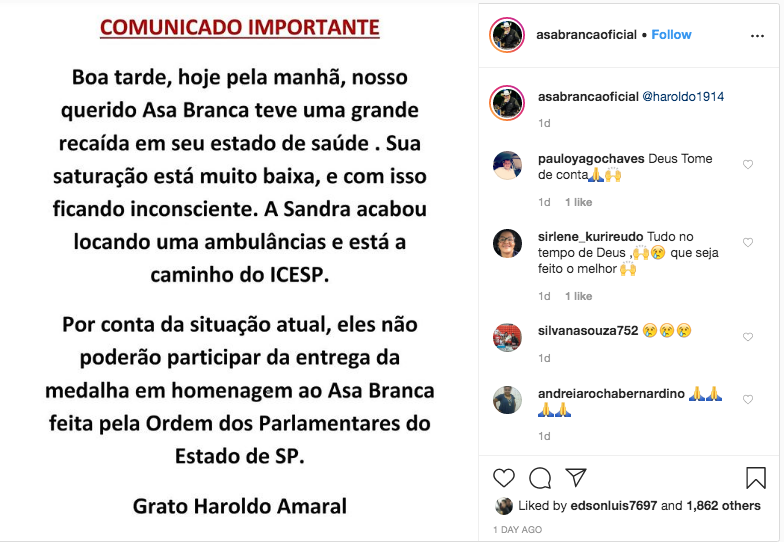 Segundo a família, Asa Branca seria homenageado neste fim de semana com a medalha da Ordem dos Parlamentares do Estado de São Paulo, mas, por conta do agravamento da doença, ele não pode participar.