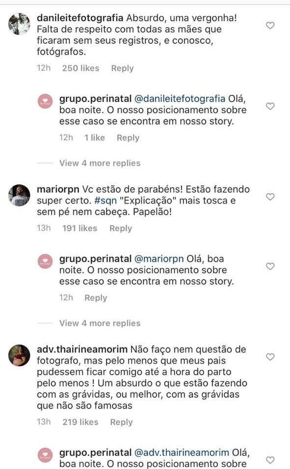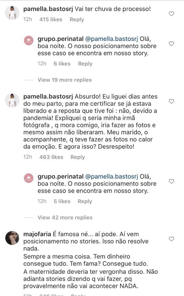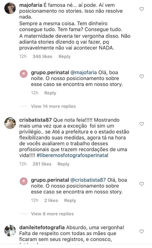 Internautas se manifestaram na última publicação feita pelo Grupo Perinatal na rede social. "Direitos iguais para todas as mães! Exceção pra uma famosa, que chacota né?", disse uma seguidora. "Absurdo! Eu liguei dias antes do meu parto, para me certificar se já estava liberado e a reposta que tive foi: Não, devido a pandemia! Expliquei que seria minha irmã fotógrafa, que mora comigo, iria fazer as fotos e mesmo assim não liberaram. Meu marido, o acompanhente, que teve fazer as fotos no calor da emoção. E agora isso? Desrespeito!", indignou-se outra.