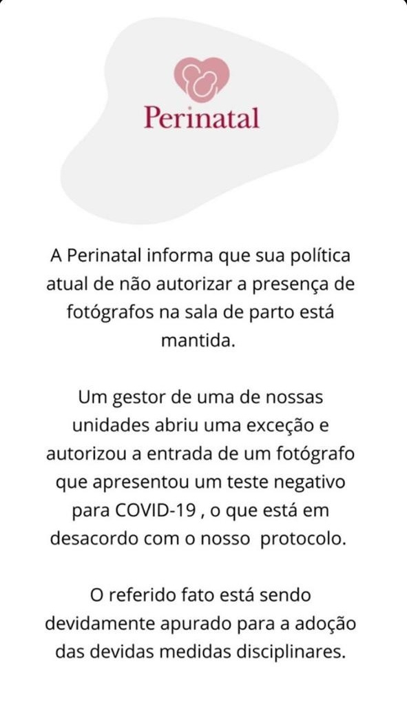 "A Perinatal informa que sua política atual de não autorizar a presença de fotógrafos na sala de parto está mantida. Um gestor de uma de nossas unidades abriu uma exceção e autorizou a entrada de um fotógrafo que apresentou um teste negativo para COVID-19, o que está em desacordo com o nosso protocolo. O referido fato está sendo devidamente apurado para a adoção das devidas medidas disciplinares", informa o Grupo Perinatal em comunicado divulgado na página oficial do Instagram.