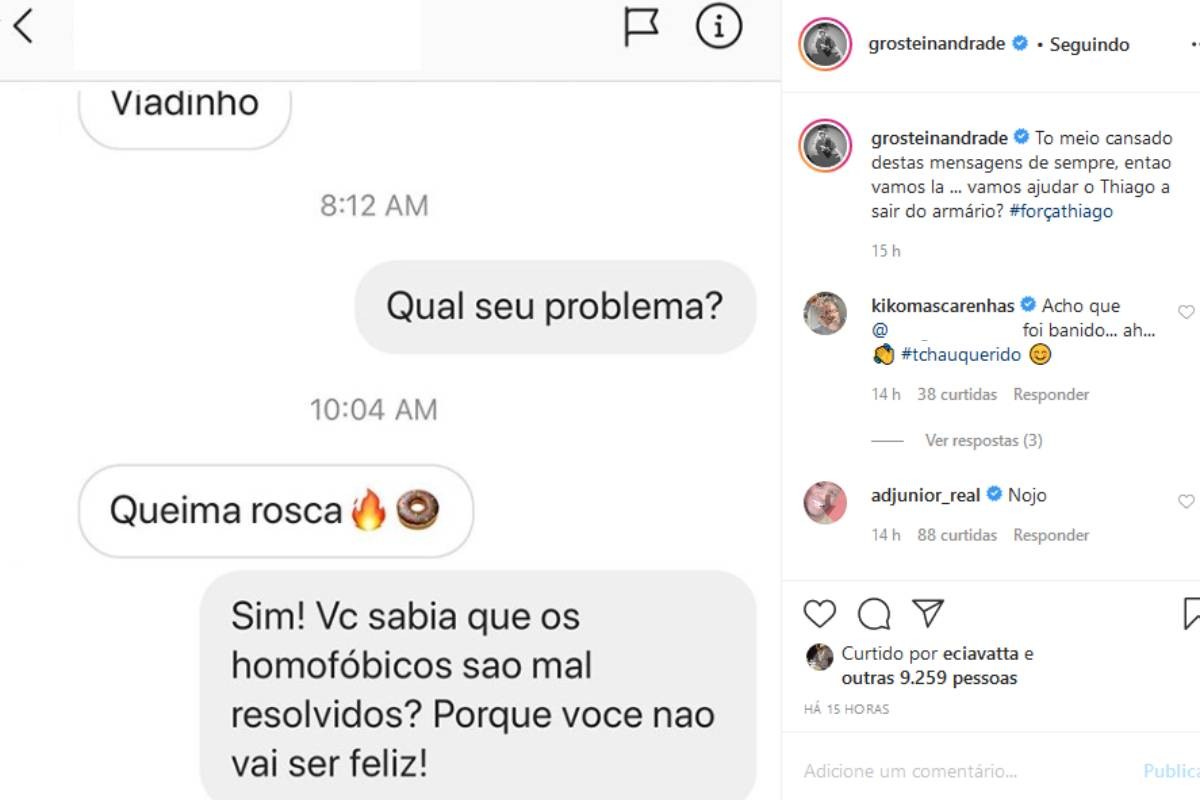 Fernando, então, compartilhou as ofensas em sua rede social. "Tô meio cansado destas mensagens de sempre, então, vamos lá... vamos ajudar o Thiago a sair do armário? #forçathiago", legendou.