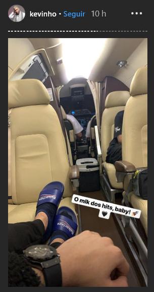 Em outra imagem, já dentro do avião, ele relaxou com as pernas esticadas no assento: "O moleque dos hits, baby!".