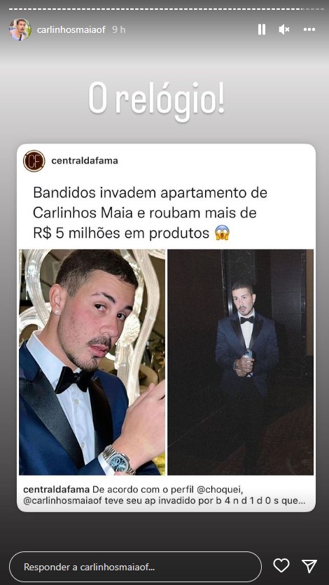 O humorista apareceu nos Stories do Instagram ainda se recuperando da recente lipoaspiração que realizou e comentou o incidente. Carlinhos Maia lamentou o ocorrido e revelou que foram levadas joias, relógios, dinheiro em espécie e até seu cofre.