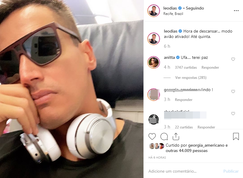 "Hora de descansar. Modo avião ativado! Até quinta", escreveu Leo. "Ufa... terei paz", comentou Anitta.