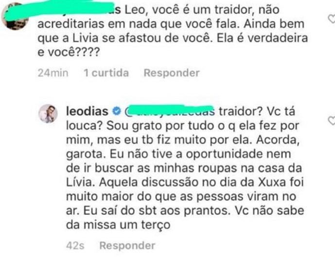 "Leo, você é um traidor, não acreditaria em nada que você fala. Ainda bem que a Lívia se afastou de você. Ela é verdadeira e você?", disparou a internauta. O apresentador não deixou barato com a ofensa e rebateu: "Traidor? Você está louca? Sou grato por tudo que ela fez por mim, mas também fiz muito por ela. Acorda garota", escreveu Dias.