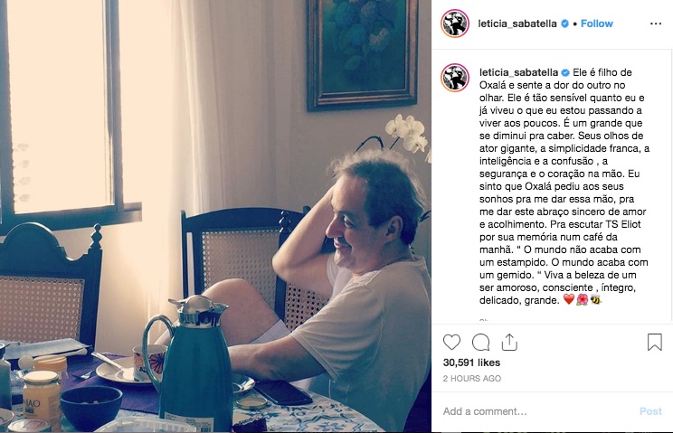 "Ele é filho de Oxalá e sente a dor do outro no olhar. Ele é tão sensível quanto eu e já viveu o que eu estou passando a viver aos poucos. É um grande que se diminui pra caber. Seus olhos de ator gigante, a simplicidade franca, a inteligência e a confusão, a segurança e o coração na mão. Eu sinto que Oxalá pediu aos seus sonhos pra me dar essa mão, pra me dar este abraço sincero de amor e acolhimento. Pra escutar TS Eliot por sua memória num café da manhã. 'O mundo não acaba com um estampido. O mundo acaba com um gemido.' Viva a beleza de um ser amoroso, consciente, íntegro, delicado, grande", escreveu ela ao compartilhar uma foto do ator.