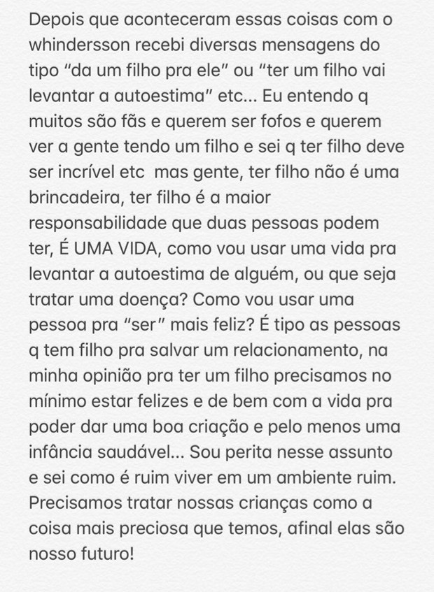 "Depois que aconteceram essas coisas com o Whindersson recebi diversas mensagens do tipo 'dá um filho para ele' ou 'ter um filho vai levantar a autoestima' etc... Eu entendo que muitos são fãs e querem ser fofos e querem ver a gente tendo um filho e sei que ter filho deve ser incrível etc, mas, gente, ter filho não é uma brincadeira. Ter filho é a maior responsabilidade que duas pessoas podem ter, É UMA VIDA. Como vou usar uma pessoa para 'ser' mais feliz? É tipo as pessoas que tem filho para salvar um relacionamento. Na minha opinião, para ter um filho precisamos no mínimo estar felizes e de bem com a vida para poder dar uma boa criação e pelo menos uma infância saudável... Sou perita nesse assunto e sei com é ruim viver em um ambiente ruim. Precisamos tratar nossas crianças como a coisa mais preciosa que temos, afinal elas são nosso futuro!", escreveu ela.